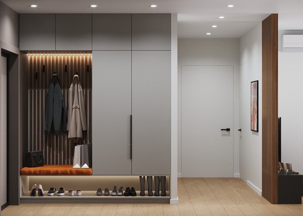 В качестве основного материала используем ЛДСП Egger. Мебельные фасады могут быть изготовлены по Вашему желанию из более разнообразного перечня: Крашенный МДФ, пластик, массив и шпон древесины, Каменный шпон, стекло.